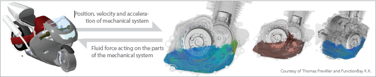 RecurDyn has an interface specially designed for co-simulation of dynamics of rigid bodies and fluids based on the MPS (Moving Particle Simulation) method.
