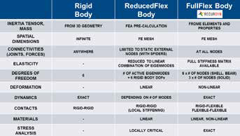 The table in Figure 12 points out the main differences between the three possible approaches to model a mechanical system in RecurDyn. The complexity of the model (and the calculation time) grows going from left to right, as the number of unknowns grows as well. The user should always choose the approach that returns the desired output with the minimum computational effort.