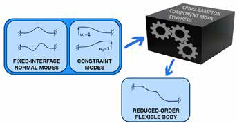 Figure 4 graphically describes the RFLex approach in RecurDyn. The modal basis, which will numerically describe the body flexibility, is created by combining two sets of structural modes: the fixed interface vibration modes and the so-called constraint modes. The result is a mathematical object whose unknowns are the multipliers of the orthonormalized modes.