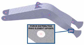 In our model, the Reduced Flex method is applied to the excavator boom. First the geometry is meshed to obtain a FE model composed by shell elements. The thickness is set in accordance with the starting CAD, while the material is set to steel (linear isotropic properties). In order to establish a physical connection between the joints and the geometry of the flexible body, RecurDyn creates Force Distributing Rigid (FDR) elements (Figure 5). Each FDR element has a master node at the joint center, and a spider of links (could be thought as rigid beams) connected to the scoped geometry. The master nodes always have 6 degrees of freedom (3 rotations and 3 translations), so that the deformations induced by both forces and moments over the structure can be correctly accounted.