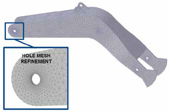 In order to highlight the benefits of the FullFlex technology, we have modified the excavator model and, in particular, the flexible formulation of the boom body. A new solid mesh is created, with specific refinements applied on the connecting areas (Figure 9). FDR interfaces are kept only for the connections of the actuators, whereas non-linear contacts are set between holes and pins on the two boom ends.