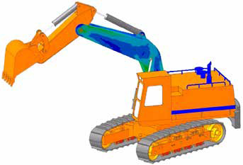 Figure 7 shows the distribution of the equivalent Von Mises stress over the boom deformed body, at the instant where it reaches the maximum value. In our example, the peak is much lower than the material strength. The highest stress is even lower than the fatigue limit, excluding any type of structural problem for this structure. By watching the animation of the results, it is easy to observe oscillations of the excavator arm that were not visible in the rigid multibody results. This is a realistic behavior, which can be easily observed in a true working excavator.